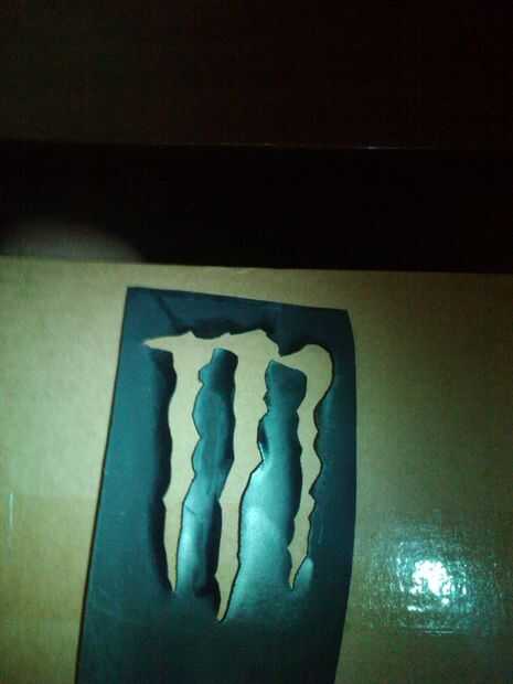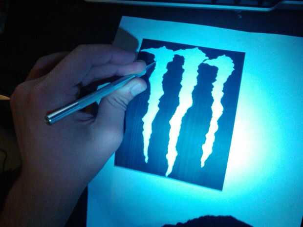 Con un cuchillo del exacto o una herramienta de corte de precisión, corte alrededor de la forma está haciendo y tirar el centro.  Mi ejemplo es un logo de monster que he utilizado anteriormente, lo sentimos para la pintura negra.