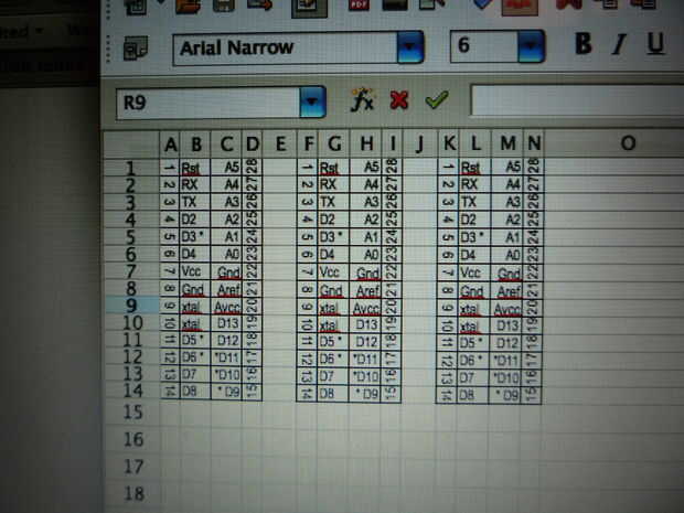 Las células tienen que ser realmente pequeña. Las filas son 0,1 pulgadas de alto para que coincida con el espaciado de 0,1 pulgadas de los pines del ATMega 168. Por ensayo y error, descubrí que la fuente más pequeña que podía usar era de 6 puntos Arial Narrow, y los anchos de columna son 0.12 pulgadas por los números (columnas A, D; F, I; y K, N), y las etiquetas de pin pueden ser 0,18 pulgadas de ancho (columnas B, C; G, H; y L, M). Una vez hice una carta, a duplicado la carta varias veces para no tener que utilizar una hoja de papel para imprimir una etiqueta pequeña.