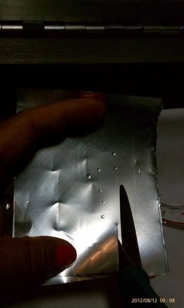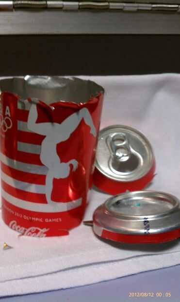 1) usé tijeras para niños pequeños porque eso era todo lo que estaba alrededor pero creo que durante mucho tiempo, trabajarían tijeras tamaño adulto. Utilizar el punto y perforar un agujero en los lados de la lata para separar la parte inferior y la parte superior. Soda de hoy y latas de cerveza no son latas de la abuela. Latas de aluminio son estos días. Son fácil de perforar y cortar. No use guantes en todo pero si te sientes más cómodo usarlas van para él. Los bordes de corte pueden pueden estar afilados y habrá fragmentos de vuelo de aluminio durante este proyecto así que protegen su área.
