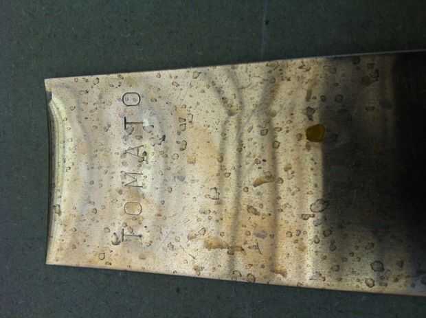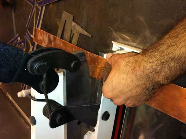 Paso 5) mediante el uso de una libra de martillo el punzón en el metal, asegúrese de tener una superficie sólida debajo de la pieza, como un tornillo de banco.