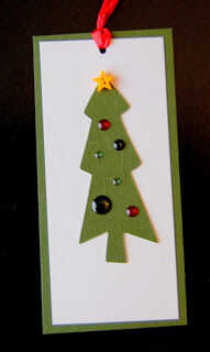 Árbol de Navidad Etiquetas: solía mi Cricut para cortar el árbol (puede utilizar un punzón en su lugar si no tienes una Cricut.)  He pegado pegatinas en para los ornamentos y pega un botón en la estrella.  He perforado un agujero en la parte superior y encadenan a través de la cinta roja