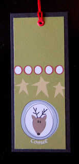 Etiqueta de Reno: compré papel en mi tienda de artesanía local que ya tenía una imagen de todos los renos a través de él. Simplemente recortar para mostrar sólo 1 Reno y había respaldado con el papel de la marina de guerra.  Puse un ojal en la parte superior y ensartadas en hilo bordado a través de.