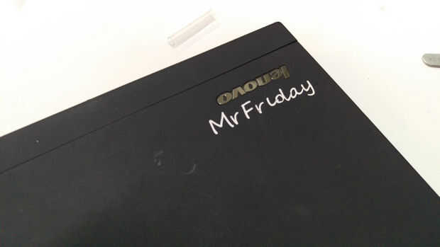 En los ejemplos anteriores, etiqueta engomada del Señor viernes también tiene un espacio donde uno puede mano-escribe sobre el nombre para un efecto más complejo.