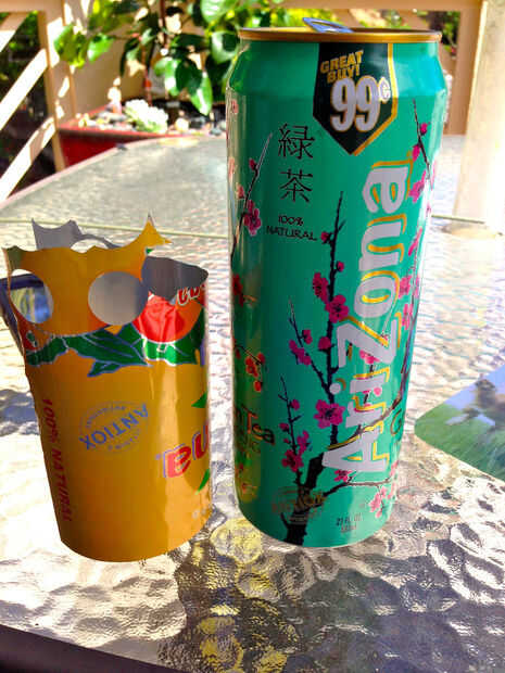 Lave el té puede apuñalar a las tijeras en la parte superior y cortar la parte superior e inferior, el puede y cortar el lado dejando una hoja de aluminio para que diseño y realce. PRECAUCIÓN que este paso puede dejar bordes afilados.