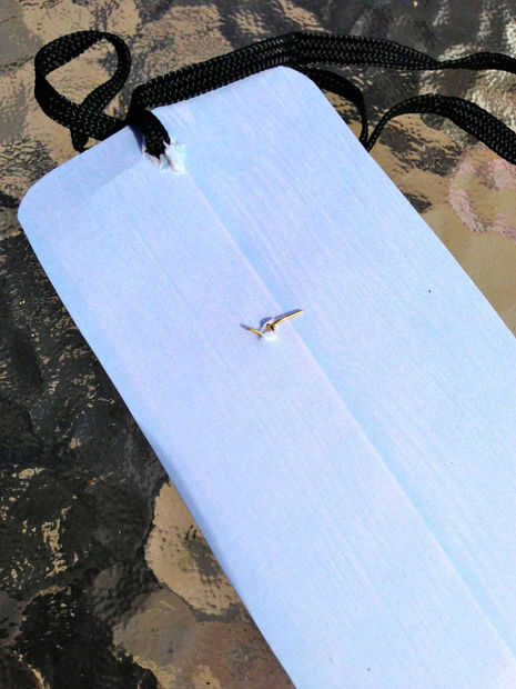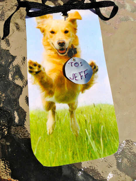 Otras piezas de metal relieve desea mover libremente en la tarjeta como en la "feliz etiqueta de perro". Que para hacer hacer un pequeño agujero en el metal y la etiqueta. Encontrar un trozo de alambre fino o cinta y a través de la pisada en la parte posterior de la etiqueta. La cinta la parte posterior para mayor seguridad. Deja un pequeño bucle en la parte frontal de la etiqueta para el movimiento.