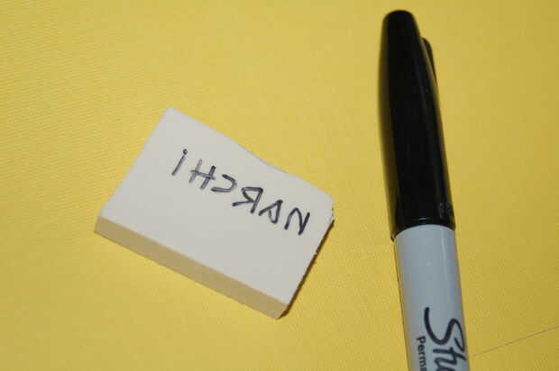 Recuerde que debido a la naturaleza de estampar la imagen debe invertirse para poder imprimir correctamente. Dibujar o escribir con cuidado en la talla rápida. Si se presiona demasiado duro que cavar en la goma. Usé un marcador sharpie porque se desliza bien sobre la goma.