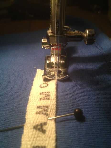 5. utilizando una aguja doble, coser la cinta de la tela cruzada en el lado derecho de la tela. En una aguja, utilice hilo del mismo color como la cinta de la tela cruzada, en el otro hilo de uso de aguja del mismo color que la tela.