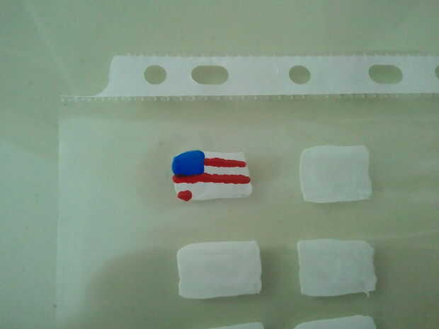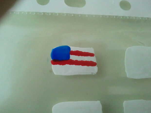 Después de terminar las rayas, puede seguir adelante y añadir las estrellas. Para agregar las estrellas, usé mi pequeña herramienta punteado en esmalte blanco para hacer 3 puntos en una fila vertical (con espacio entre). Entonces agregué 3 puntos ligeramente a la derecha, con los puntos situados entre los espacios de los puntos anteriores (ver última foto). Luego continué así hasta llegar al otro lado.