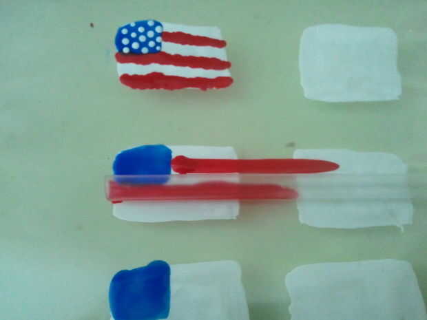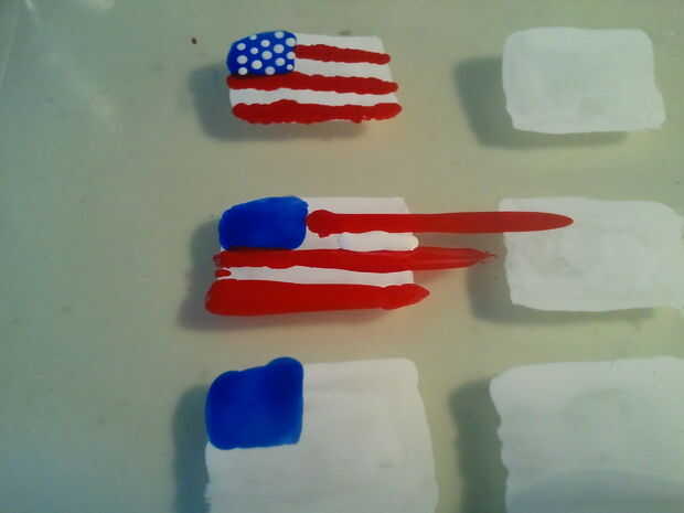 No añado las estrellas todavía, pero puedes hacerlo después de terminar las rayas. Para agregar las estrellas, usé mi pequeña herramienta punteado en esmalte blanco para hacer 3 puntos en una fila vertical (con espacio entre). Entonces agregué 3 puntos ligeramente a la derecha, con los puntos situados entre los espacios de los puntos anteriores (ver última foto). Luego continué así hasta llegar al otro lado.