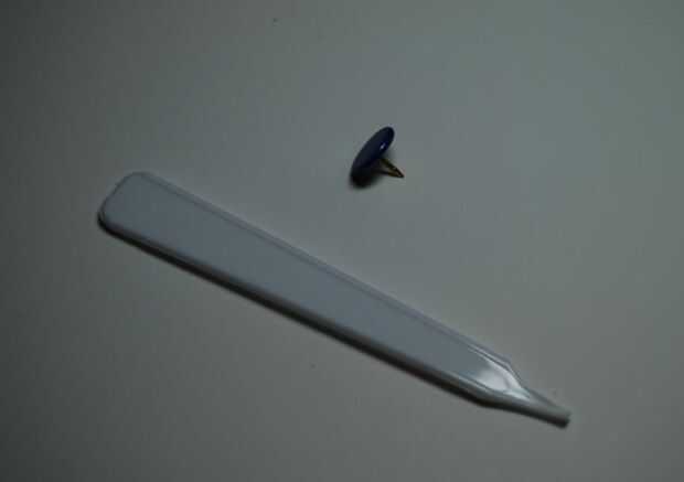 La etiqueta "avanzada" de jardín es el única que elimina la necesidad de la escritura del género de la planta en él mediante el uso de un sistema del color-código. He encontrado esta muy útil para muchas de mis plantas y especialmente de mi cactus, como en lugar de tener que meter yo mismo cada vez que recojo una etiqueta para ver el género de la especie (sí, ya sé es parte de la afición, pero cuando vas a través de un montón de Opuntia, es redundante), simplemente tengo que analizar mis ojos sobre las etiquetas y buscar ciertos colores. Para comenzar la construcción de esta etiqueta, una etiqueta sin etiqueta del método básico y elegir una chincheta de color que desea utilizar para representar el género de la planta de la etiqueta será de (por ejemplo, en este caso, utilicé una chincheta azul para representar a