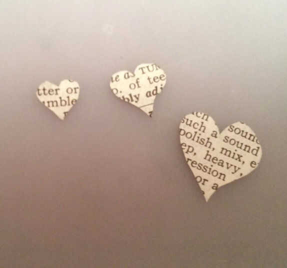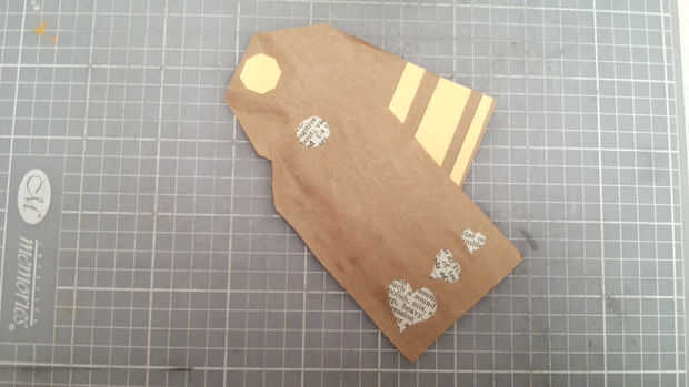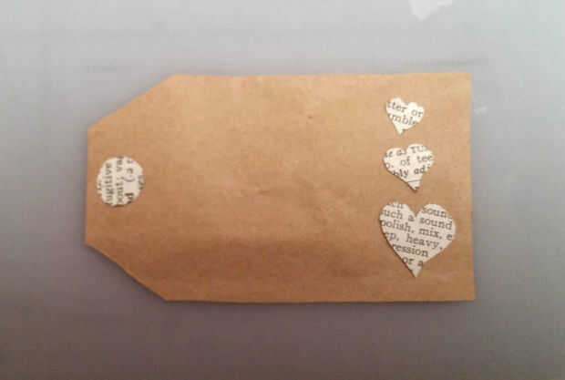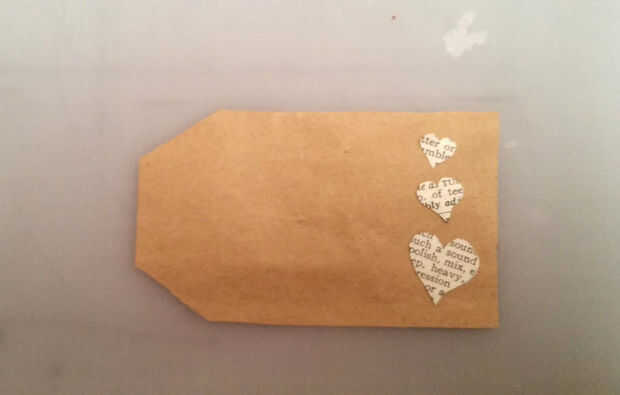 Ahora utilice el papel de diccionario o la muestra de pintura para agregar su diseño de detalle. Usé una de las etiquetas para regalo de boda corte corazones del papel del diccionario y había pegado sobre la etiqueta. Para la etiqueta de chip de pintura he creado rayas para añadir un poco de color y estilo.