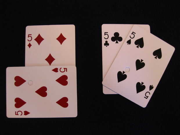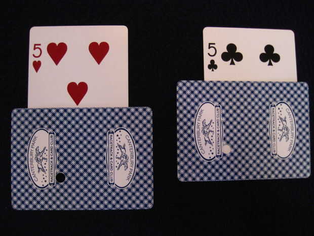 Grabación de la partitura: Use los cincos en la cubierta para mantener la puntuación (cada equipo tiene dos 5 del mismo color). Para los primeros cinco puntos gire uno 5 boca arriba y el otro hacia abajo. Utilice la carta boca abajo para revelar el número apropiado de corazones/diamantes o espadas y clubes. Para 6-10 puntos, voltear dos tarjetas y deslícelos apropiadamente para revelar el número correcto de puntos.