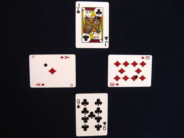 Despedir a: En primer lugar, fingir eres el distribuidor y las espadas son trump. Se llevó un diamante y su triunfo de socio (jugador 2) con el gato de clubs (bower izquierdo). Jugador 3 a continuación juego conduciendo un diamante; por lo tanto, su pareja ya ha ganado el truco. Su próximo paso depende de si tienes un diamante o no. Si tienes un diamante, debe sentar para seguir su ejemplo. Si tienes más de un diamante, pone el uno más bajo para guardar sus tarjetas mejor. Sin embargo, si no tienes un diamante, puede tirar lo que quieras. En este caso, desea colocar su tarjeta peor porque su pareja ya ha ganado el truco. Esto significa que su menor no-baza (si tienes) o poner su baza más bajo si sus única cartas restantes son trump. Por ejemplo, si tuvieras el Jack de espadas (derecho bower), que desea guardar para una mano más adelante. De hecho, su pareja probablemente no sería muy feliz contigo falsos su carta ganadora (Recuerde, usted está jugando como un equipo). Este concepto se llama "colocación" porque no están poniendo su mejor tarjeta. La imagen de abajo muestra este ejemplo, es el distribuidor de jugar su carta más baja no-trump (nueve de tréboles).