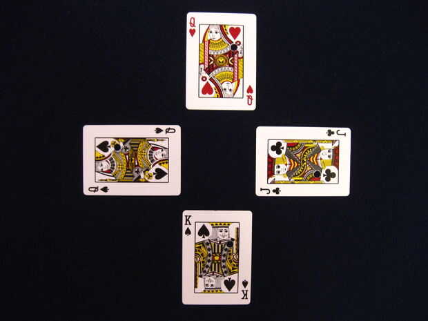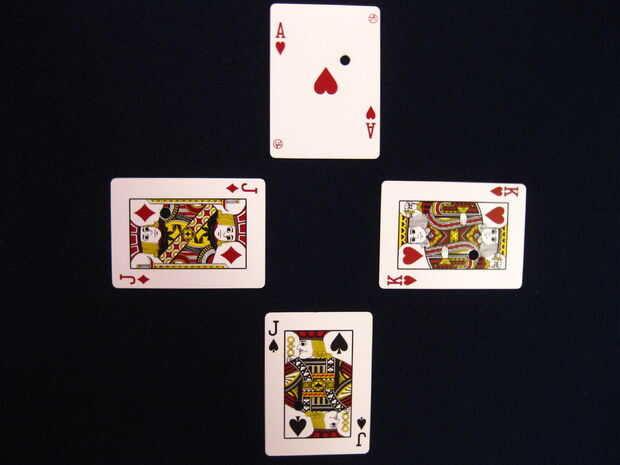 Ejemplo 1: Corazones son trump y el Jack de diamantes (bower izquierdo) es el plomo. Puesto que el Jack de diamantes en este caso se considera un corazón, los jugadores 2 y 3 seguir y jugar un corazón. El crupier no tiene un corazón y a lanza en una pala. El jugador 1 gana el truco.