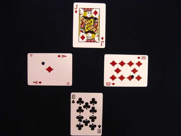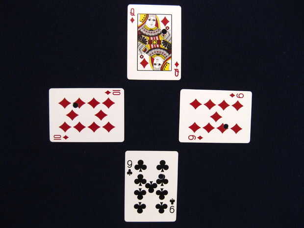Ejemplo 2: Los clubs son triunfo y diamantes son dirigidos. Los jugadores 2 y 3 ponen diamantes para seguir su ejemplo. El concesionario, sin embargo, no tiene un diamante y triunfos con los diez clubes para ganar el truco.