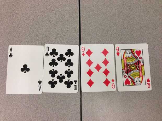 Corazones es una baza en este juego. Lugares de jugador 1 a 10 de diamantes de abajo. Jugador 2 juega un as de diamantes. Jugador 3 no tiene diamantes ni Ases y coloca un 10 de espadas. 4 jugador juega a un rey de diamantes. Jugador 2 gana la mano con el as de diamantes desde que era la carta más alta que jugó y no fue jugado ninguna carta de triunfo.