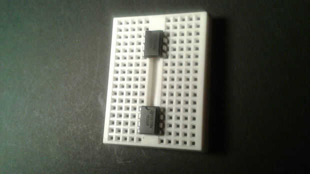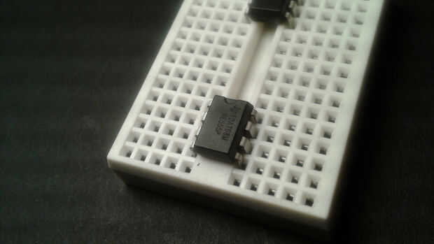 Primero le instalamos las virutas y potenciómetros (potes). Ver las fotos de arriba para más detalles. Fichas generalmente tienen una muesca en un extremo. Esto marca la 'top' de la viruta. Los pines están numerados a partir de la parte superior izquierda y continuando hacia la izquierda alrededor del borde del chip.