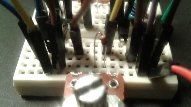 B la viruta está conectada a continuación. Tenga cuidado con la polaridad correcta en el cap de 10uf. Electricidad sólo puede fluir en una dirección a través de un condensador. Asegúrese de que el lado del cap de 10uf con la banda se conecta a la fila vacía donde se conecta el altavoz.