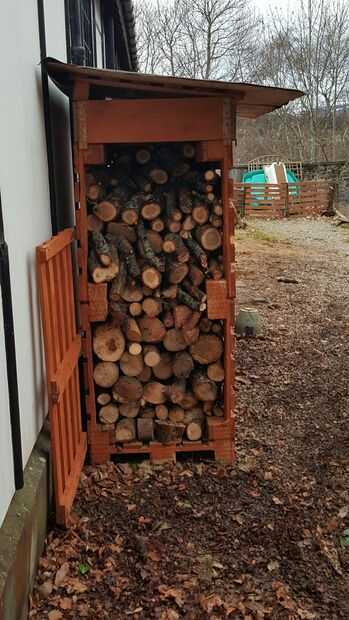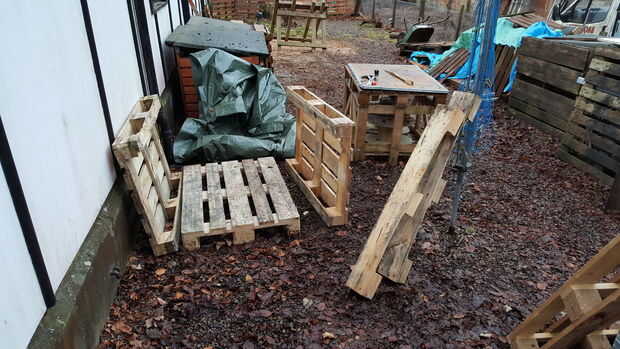 Mi esposa y yo encontramos se estaba convirtiendo en un dolor al agacharse y alcanzar en nuestras original plataforma construida DIY paleta casera registro las vertientes. El original uno está detrás de la lona verde. Por lo tanto, me embarqué en buiding arrojan un registro de la plataforma mucho más alto de las plataformas del Euro.