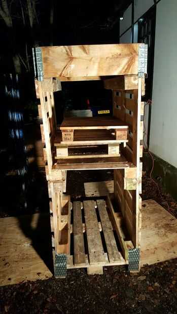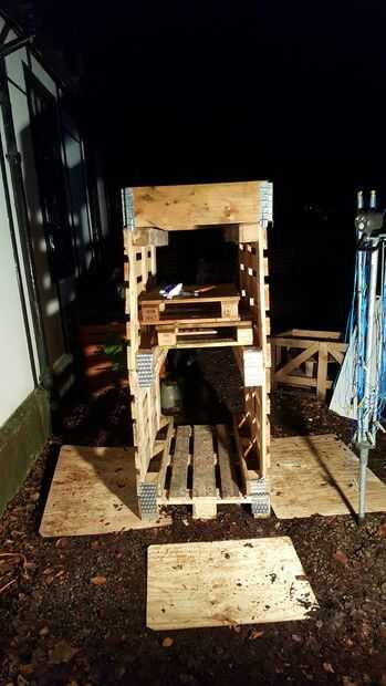 Repetir utilizando la barra de arruinamiento saque una media de 2 plataformas del Euro más y poner las paletas respectivamente sobre las paredes de lado la plataforma anterior y poner la 2 mitad euro-palets con ontop de tableros de panel de madera de las patas de la plataforma como se muestra. Además agaon se pone con el Euro panel en la parte superior para ayudar a alinear los lados de la plataforma.