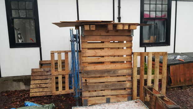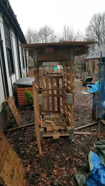 Puertas. Usando la destrucción barra quitar todas las patas de 2 plataformas más. Las 2 paletas se convertirá en las puertas del cobertizo de registro.
