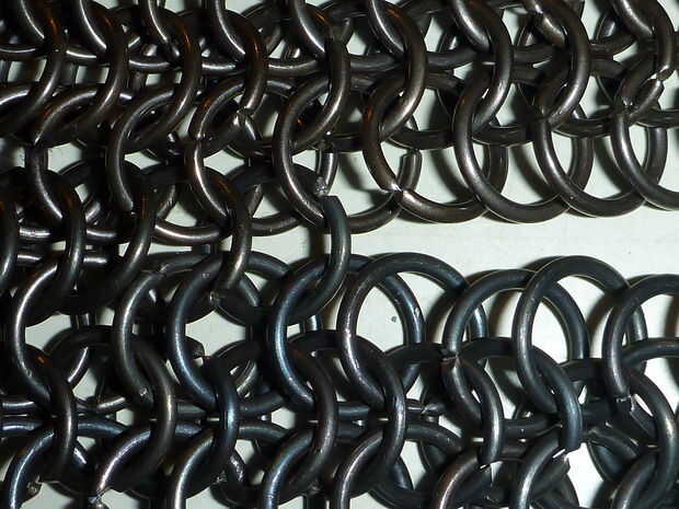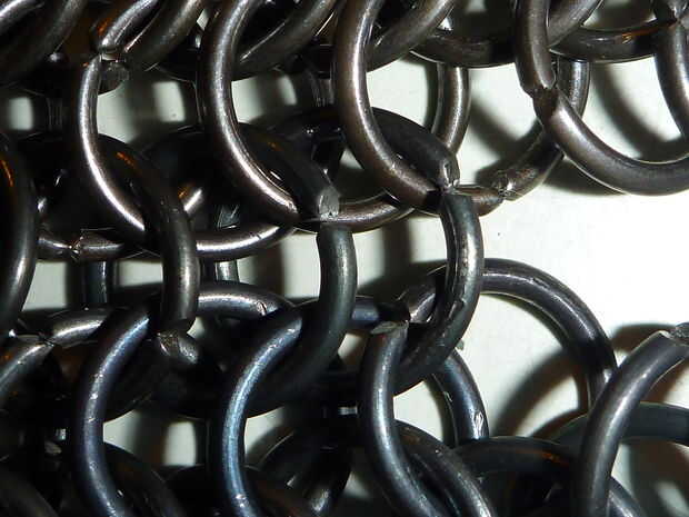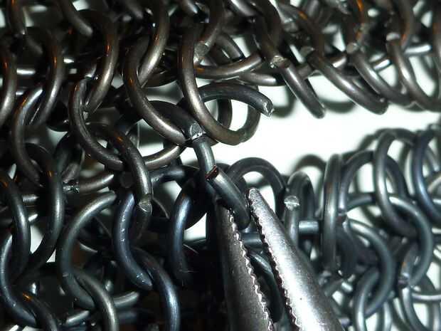 Toma un anillo abierto (obviamente) e insertarlo en tres anillos en cada pieza y cerrar usando sus alicates. Seguir adelante hasta que esté Unidos.