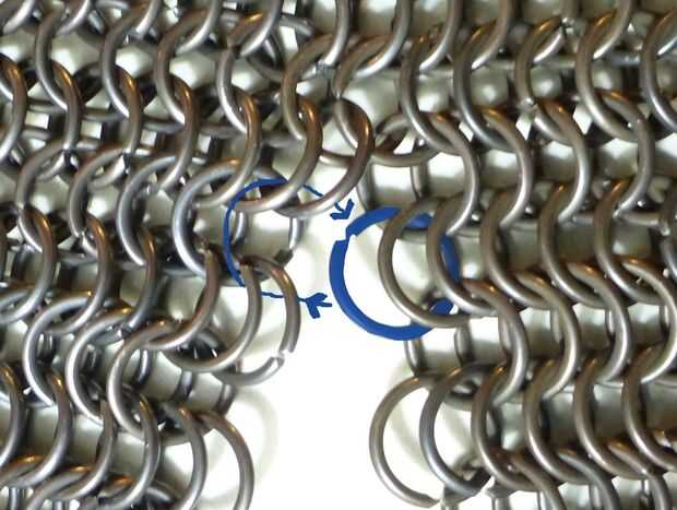 Coincidir los extremos de la cota donde se ve como una cadena continua. Utilizando los anillos ya en los extremos de las piezas de correo cadena de unir los dos juntos identificar la fila del centro de las cadenas y abriendo el primer anillo y pasando por los cuatro en la pieza opuesta. A continuación, tomar el segundo anillo en la fila y abrirlo, pasando por el contrario dos. Bastante simple, ¿EH?