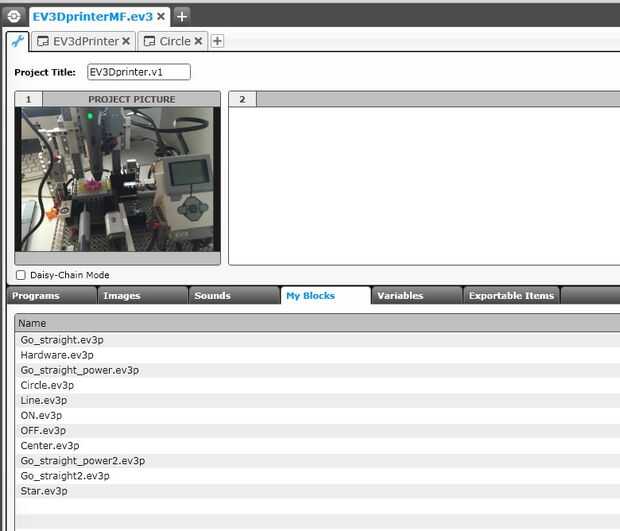 Se trata de una impresora 3D constituida el kit de Lego Mindstorms EV3. La base de es la pluma 3D que dispensa el plástico derretido. Movimiento de la pluma en 3 diferentes ejes es aprovisionado por motores mindstorms y son controlados por lego minds