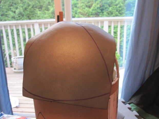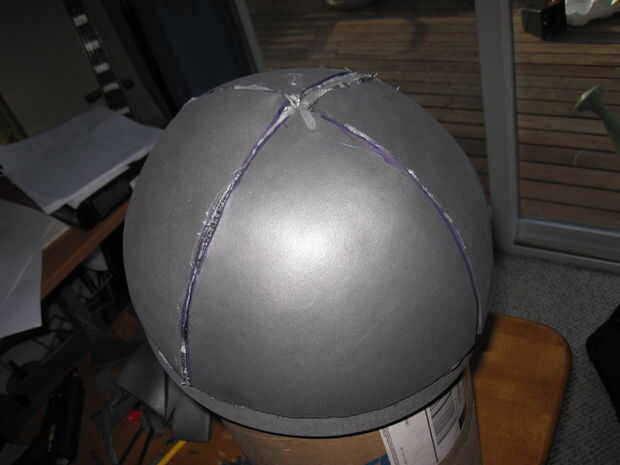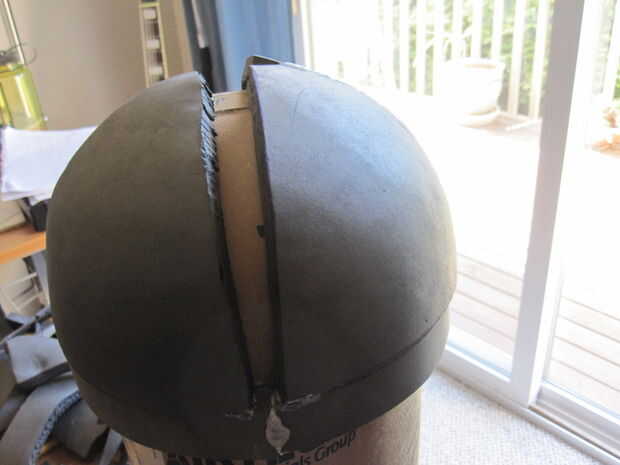 La parte superior de la banda se pegan a otras piezas de espuma, así que es mejor dejar el lado peor mirando para arriba y dejar el borde limpiador abajo donde puede mejorar la apariencia final de la caña. La banda que hice tiene dos costuras pegamento, como puede verse a continuación. Esto no es ideal, pero hice el trabajo de espaciado uniformemente hacia fuera en referencia a las uniones de pegamento en el resto de la tapa del cráneo. Esto es importante porque usted tendrá que cubrir las uniones con otras piezas de espuma y por espaciado uniformemente estos que pueden ser estratégicamente cubiertos por una espuma fina que parece recortar en lugar de una pieza colocada al azar de espuma.