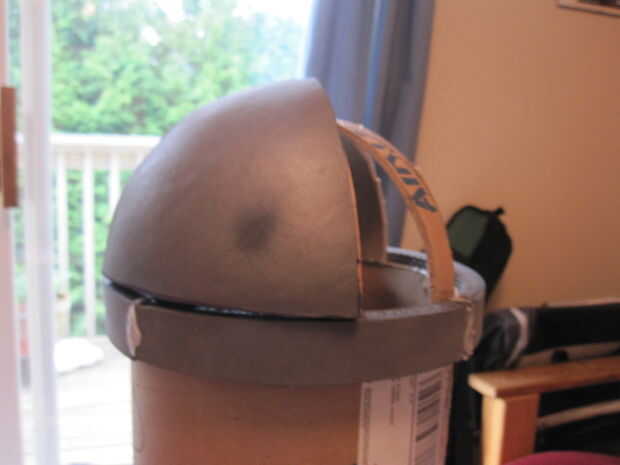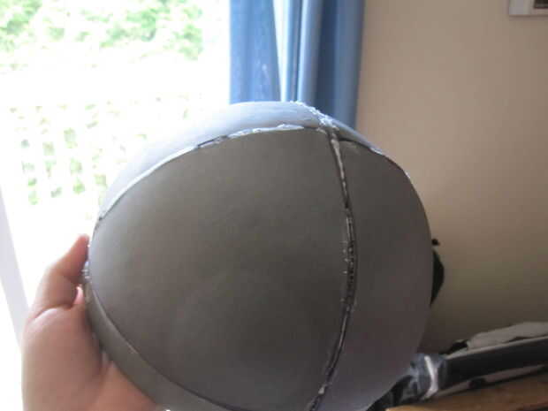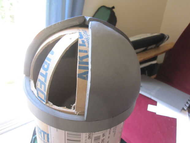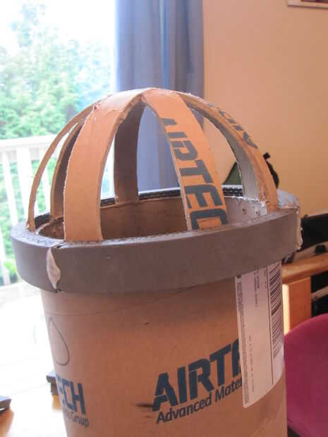 Repetir tres veces más para hacer cuatro cuartos de la media esfera. Coloque todo el marco con la banda para comprobar la alineación y ver si alguna podrá recortar o formando necesita suceder antes de pegarlas. Cuando esté satisfecho, pegar con pegamento caliente, mientras se mantiene en el marco pero evitar pegar la espuma a la estructura de cartón sí mismo. Comenzar pegando su primera pieza en la parte superior de la banda de espuma y pegar secciones pequeñas en un momento hasta que adhiera toda la pieza. Usando este método del poco a poco, pegar pequeñas porciones de la espuma, continuar el proceso con el resto de las piezas hasta que terminas con un gorro terminado como en la imagen.