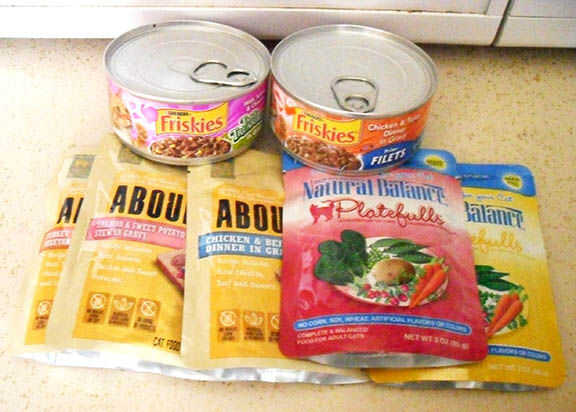 Pop top latas (no puede el necesario del abridor) son una buena opción y plataforma muy estable. También estoy viendo mucho más marcas que ofrecen alimentos húmedos en bolsas de aluminio, que son más delgados y flexible y por lo tanto muy fácil de empacar.