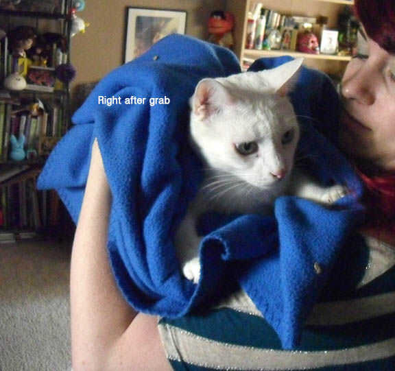 Paño grueso y suave manta de. Las mantas de lana de tamaño personal barato que ves en la tapa del extremo en el CVS son perfectas. Usted podría también hacer su propia con yardas de paño grueso y suave. Obviamente es buena para el calor y la ropa de cama una manta, pero también es una valiosa herramienta para recoger un animal asustado. Proporciona una barrera para protegerse de los dientes y las garras, le da un mejor agarre y a veces ayuda a calmar a los animales. Una vez que ayudó a rescatar a un pequeño perro callejero del centro de una calle muy transitada, y la manta es lo que lo hicieron posible. Se negó a ser tocado, pero de alguna manera utilizando la manta hizo ok porque usted realmente no le toca. * Recuerda el estado psicológico del animal en un momento como éste y actuar de una manera que les hará sentir seguro / a gusto. Abordarlos con calma y seguridad.