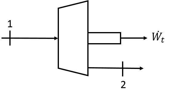 Antes de llegar a la identificación de valores, voy a explicar brevemente el diagrama. El trapezoide representa la turbina, y el rectángulo que sale el trapezoide representa el componente de generación de energía de la turbina. Las flechas representan el flujo del agua a través de la turbina. Este es un método bastante estándar diagrama utilizado en termodinámica.