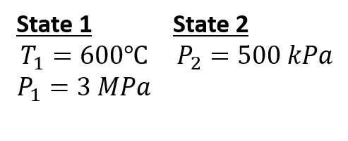 Determinar las conocidas y las incógnitas del ejemplo dado. En la gran mayoría de problemas que una turbina de vapor, se requerirá para solucionar para el trabajo de la red (Wdot). Crear una tabla de estado identificando el antes y después de los Estados (uno y dos) donde se registran estos datos. Registrar todos los siguientes que son: presión, temperatura y caudal de masa (mdot).
