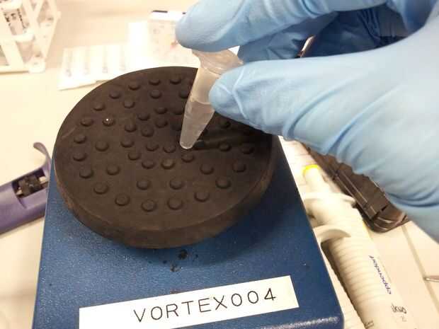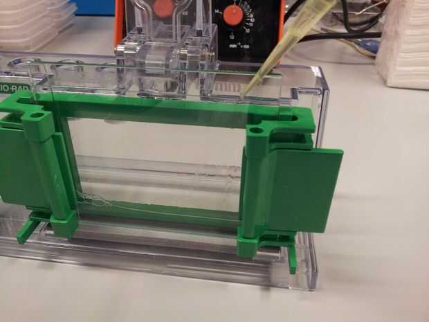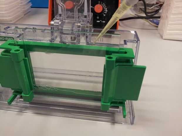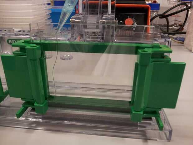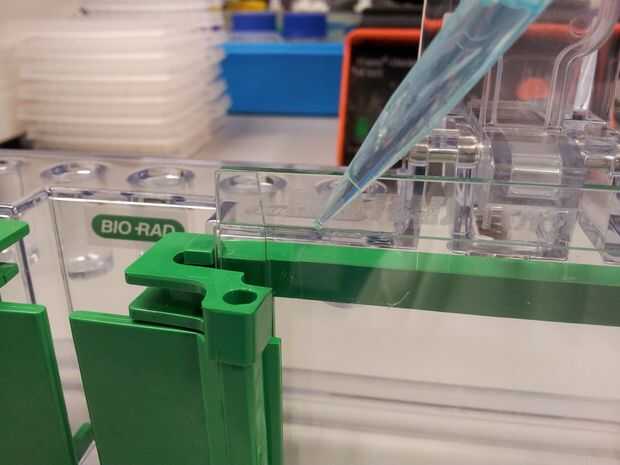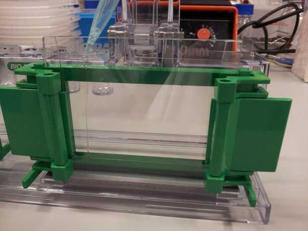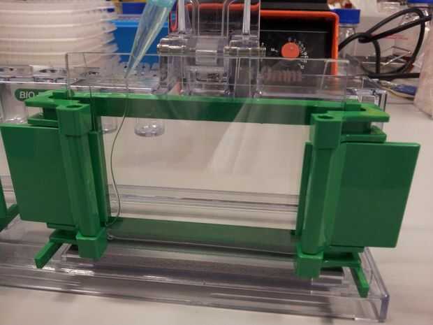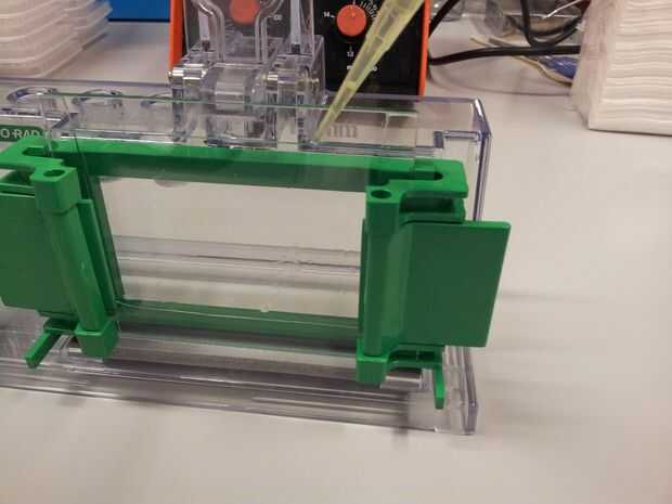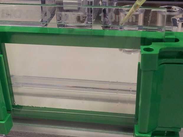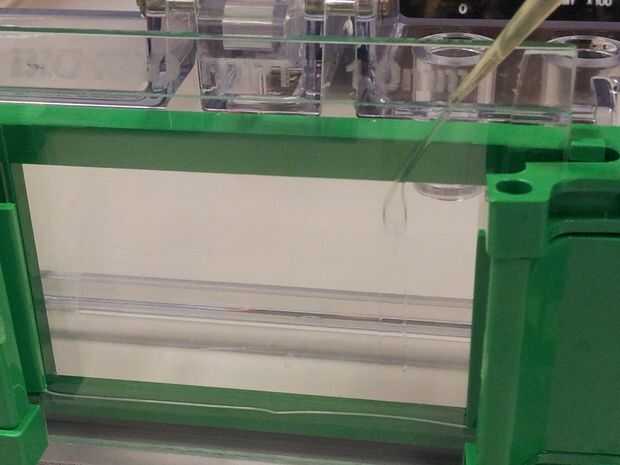 2) después de la transferencia de las soluciones de gel mezclado en el tanque del gel, propan-2-ol (es decir, isopropanol) se agrega en la parte superior de la capa de gel para evitar que el aire llegando a la solución de gel (que se espera que inhiben la formación de gel).