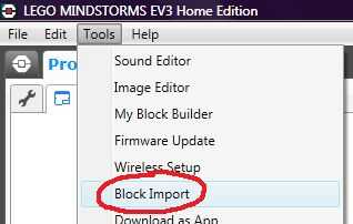 Inicie el software de LEGO MINDSTORMS EV3 y crear un proyecto nuevo, vacío. Seleccione el menú herramientas y luego bloque de importación.