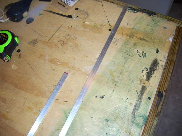 Con la Sierra de mano corta 2 tiras de 10" de la tira de aluminio. Aparte de un conjunto. Con la otra pone contra la botella de agua medio camino abajo de un lado de la botella y la marca con un rotulador en la tira donde cuelga más allá de la botella. Poner la tira en su vice y doblar a 90 grados. Poner contra la botella de agua y repita hasta que usted ha hecho un cuadrado fuera de la franja.