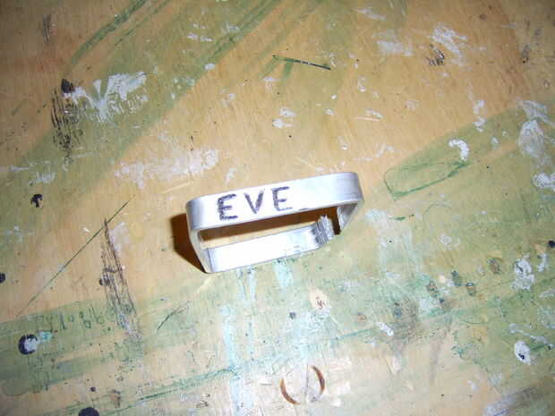 Una vez que tiene su plaza tomar un rotulador y escribe Eva al lado, luego tome su grabador metal y vaya sobre él. Una vez has grabado la víspera en el lado volver sobre él con un rotulador. Te recomiendo un rotulador azul, es de qué color es en todas las fotografías que encontré en línea. Pero si todo lo que tienes es de color negro que trabaja demasiado.