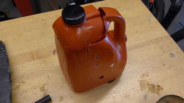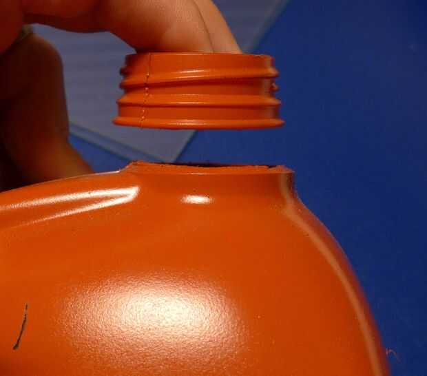 Utilice una maquinilla de afeitar Sierra, Sierra del corte, etc. para cortar la boquilla y la tapa bien por debajo del labio grande. Ser aseado y apartar el surtidor para más adelante. Volver a usar la sierra, retire el resto de la boquilla, dejando una buena abertura redonda como se muestra arriba.