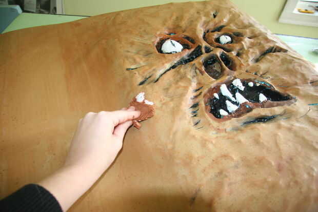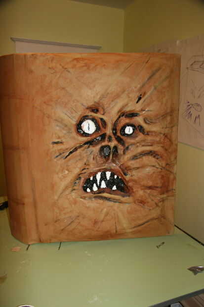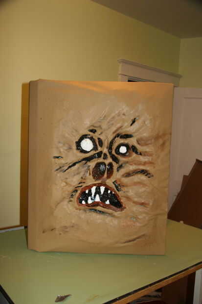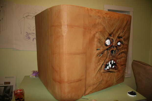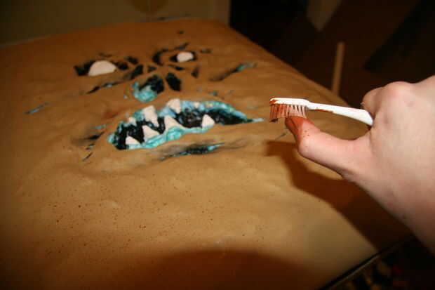 Esta es mi parte favorita. Obviamente tuve que disimular la espuma azul que fue expuesta a través del corte las partes de la cubierta, así como agregar textura y profundidad. Yo sólo se utiliza el negro, marrón y blanca pintura acrílica. Los ojos y los dientes fueron pintados de blanco y la parte más profunda de la cubierta fueron pintado de negro.