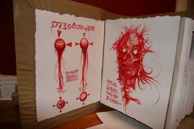 También había frotado un saquito empapado en el papel blanco y usa pintura marrón sucio las páginas.