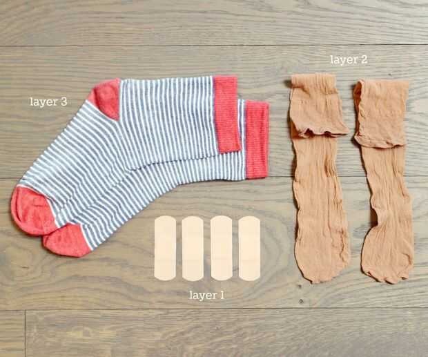 Se trata de una técnica de capas. El objetivo es que la fricción ocurren entre las capas de tela y no sobre la piel. Aquí está lo que usted necesita para proteger sus footsies: