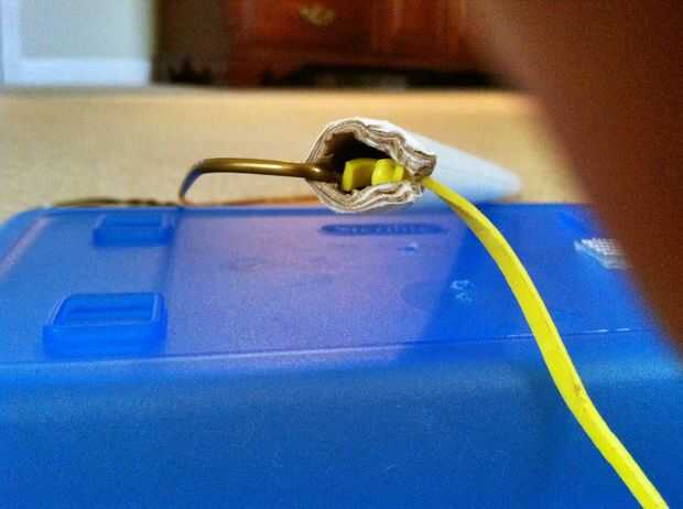 Ahora Inserte uno de los nudos extremos de la goma en una de las ranuras del cartón.