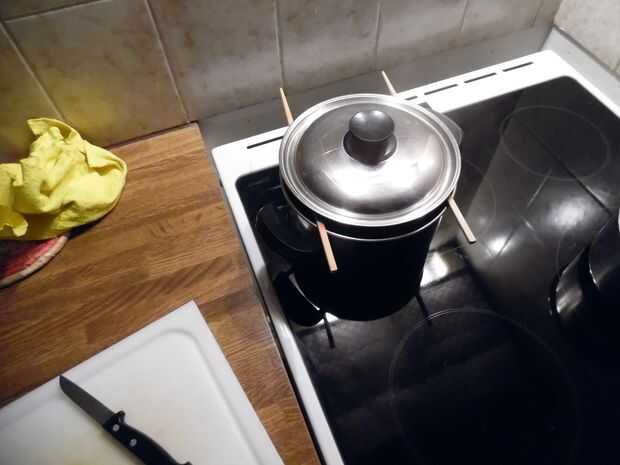 Agregando sal o aceite no parece ayudar mucho. Hervir la pasta en grandes volúmenes de agua podría hacer el truco (pero no tengo una cacerola más grande libre). Ya que podría deformar una cuchara de madera y una cuchara solo es menos más fácil equilibrar la tapadera, los palillos de madera ¿por qué?