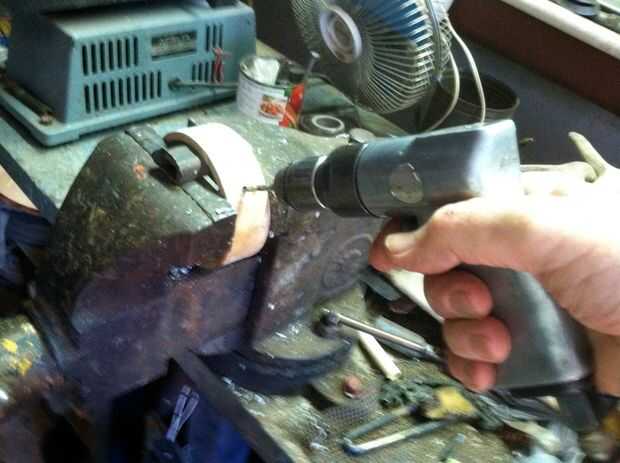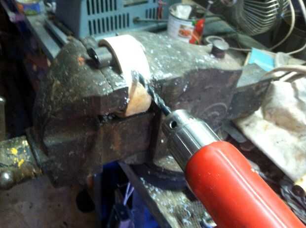 Apretó la banda en el tornillo de banco, alineando los agujeros guía que perforó en un lado del centro con la parte superior de la mordaza. OK, eso es algo confuso, pero necesitaba alinear el agujero perforado!"del centro con el agujero perforado 4.5" de centro, por lo que podría introducir una varilla de un mango.