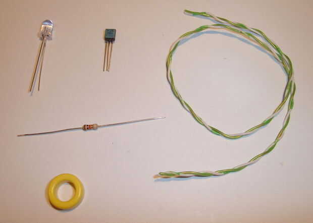 -una tira de toroide con un interior de 7 a 10 mm de diámetro. Necesita para ser del tipo de alta inductancia, para las frecuencias bajas. Aprendí blanco/verde tipos para altas frecuencias no funcionan. Blanco/amarillo los hacer. Una fuente común son fuentes de alimentación de ordenador o supresores de ferrita núcleo sólido para cables redondos.