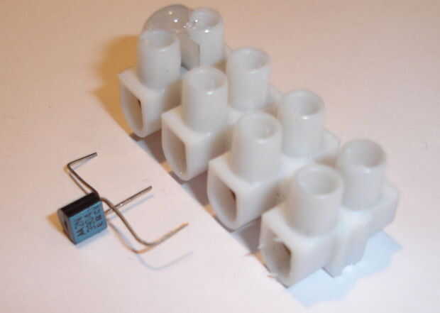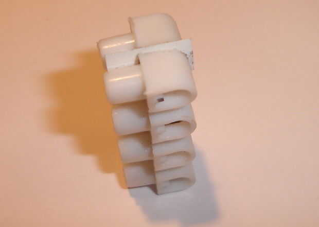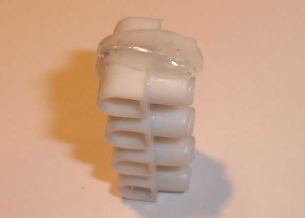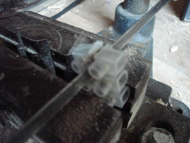 Vio por en medio de una de las conexiones del bloque de conexión (un tornillo de banco es útil). Limpie el polvo aserrado soplando en el pegamento corte ant en el pequeño pedazo de plástico con pegamento (hot melt).