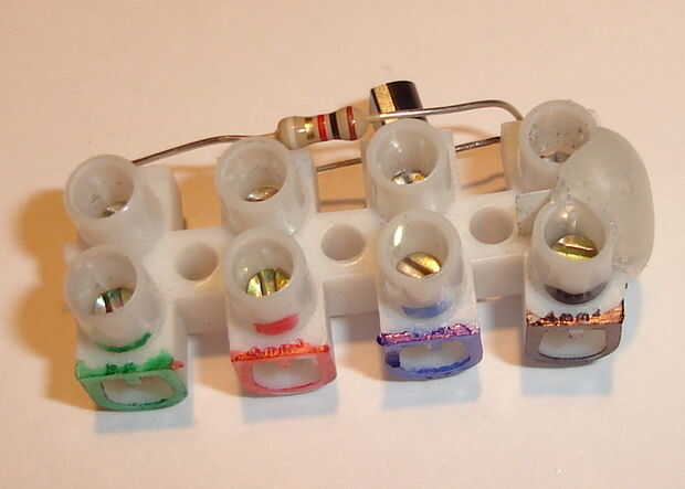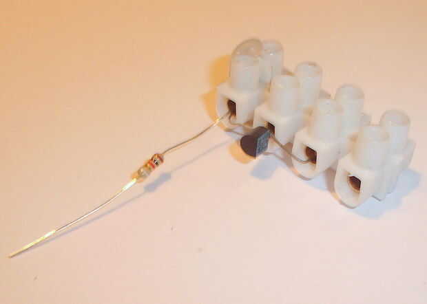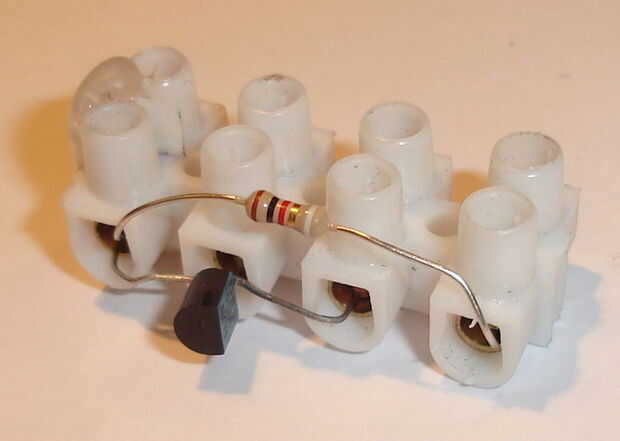 Deslice las patas del transistor en el bloque de conexión, asegurándose de que el B(ase) está en la conexión corta a través. Atornille firmemente el C(ollector) y E(mitter), asegurándose que las patas del transistor toman. Poner en un cable de la resistencia con la pata de B(ase) del transistor y el tornillo firmemente. Curva bien lejos la resistencia del transistor de la piernas y hacia el contacto restante, se conecta el resistor's otro cable.