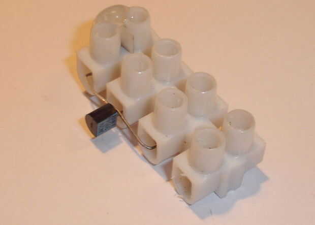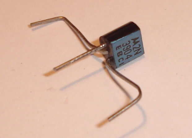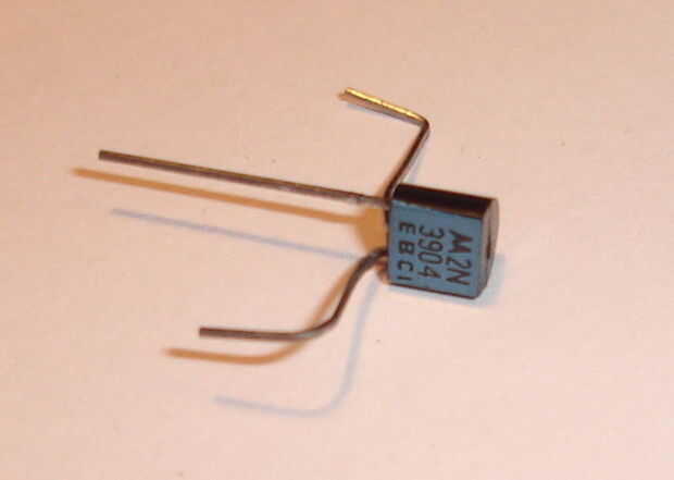 Doblar las patas del transistor como se muestra. Si el transistor no tiene ninguna marca EBC, usted puede resolverla después de la foto, saber que los conductores todavía deben ser en el mismo orden si es del mismo tipo (en otros casos consultar la hoja de datos). Doblar hacia atrás la B(ase) y C(ollector) remite. Teniendo en cuenta las dimensiones de la conexión de bloque, doblar el extremo de estos dos patas abajo otra vez. Corte el E(mitter) ligeramente más largo que el doblado hacia abajo los extremos de las patas del otro.