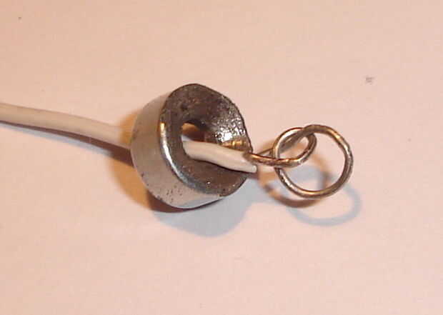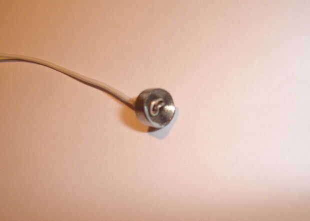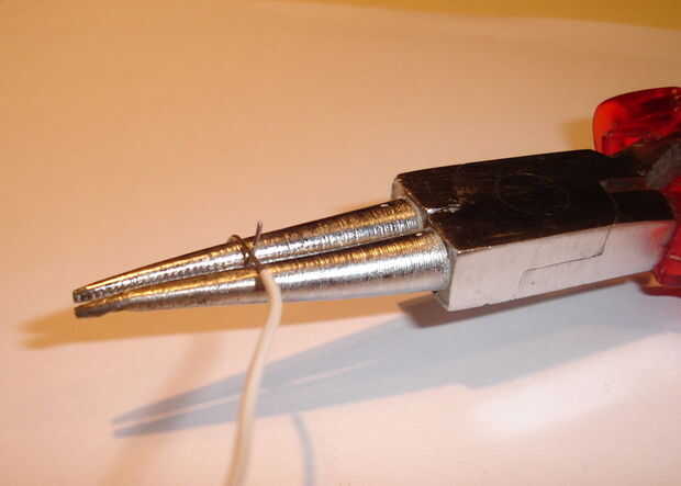 Saque de los cables de 20 cm, unos 2,5 cm de aislamiento. Hacer un lazo alrededor de la sección media de los alicates de nariz de aguja. Vuelva a colocar el lazo entre los extremos de las pinzas y deslice el cable a través del lazo, haciendo un nudo. Corte el extremo del cable corto incluso más corto a un par de mm y doblar espalda paralelo con el extremo largo. Deslice el cable por el orificio del imán. Si el imán tiene una cavidad, presione el nudo en ella. No importa si se desliza hacia atrás en este momento, brazo de zombie impedirá más tarde. Repita con el segundo cable de 20 cm y el segundo imán.